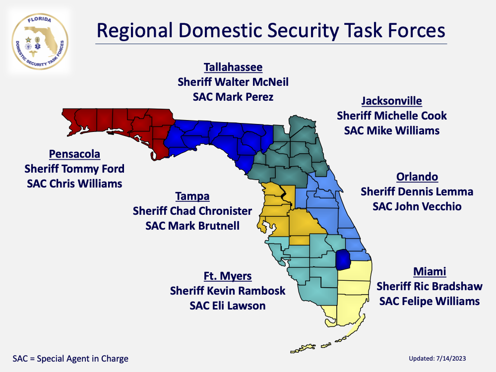 The state’s seven (7) Regional Domestic Security Task Forces (RDSTFs) are the foundation of Florida’s domestic security structure. Each RDSTF is co-chaired by a local Sheriff or Police Chief and an FDLE Special Agent in Charge (SAC). Task force members include first responders from the disciplines of fire/rescue, emergency management, public health and hospitals, as well as law enforcement. The task forces also work in partnership with schools, businesses and private industries. By utilizing a multi-disciplinary approach, the RDSTFs provide support to impacted communities by serving as a force multiplier for local agencies, and working in conjunction with emergency management professionals.